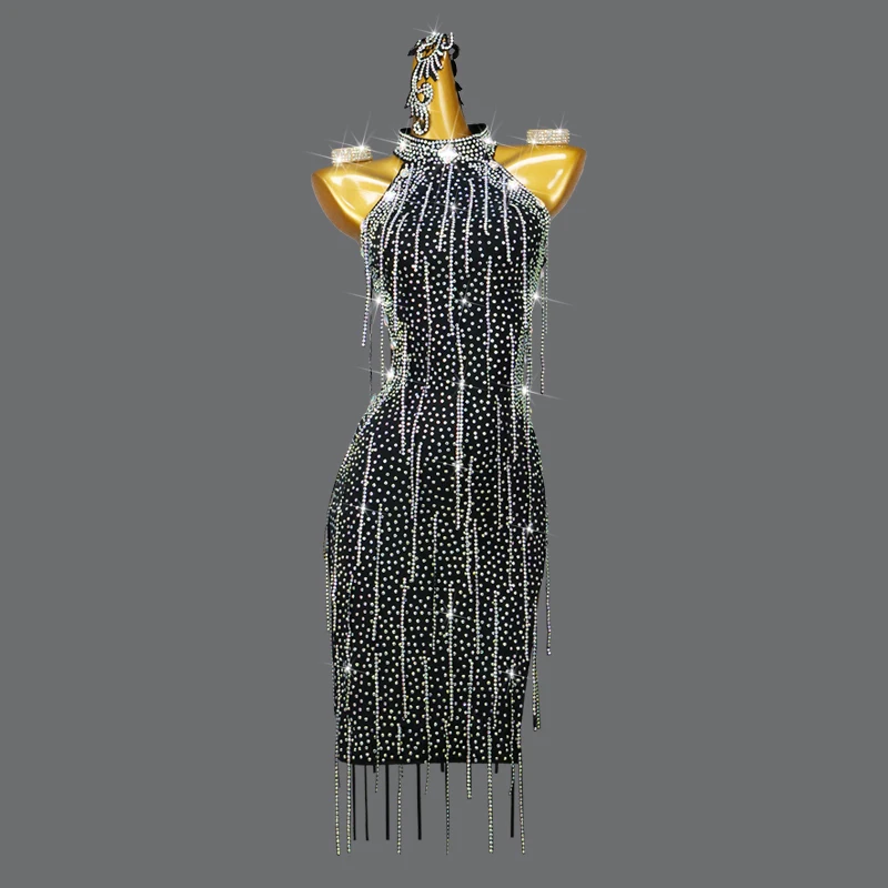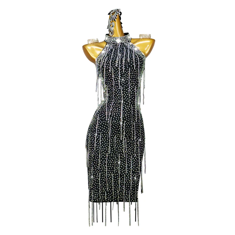 Black Rhinestone Tassel Women Latin Dance Dress Performance Costume Latin Dress for Girls Dance Costume Party Evening Gown Dress